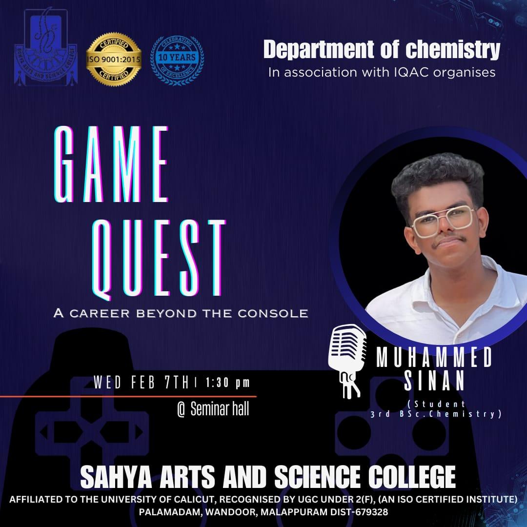 The Game Quest event organized by Sinan Punnappala, a Third-year student of Chemistry, was inaugurated by Ms. Shabnam, Head of the Department of Chemistry. Her presence added an air of prestige to the occasion, setting the stage for an exciting and intellectually stimulating event. Ms.Nashana MP, with her eloquence and warmth, delivered a captivating welcome speech, setting the tone for the event. Her words not only welcomed the participants but also inspired them to fully immerse themselves in the challenges and fun that awaited them in Game Quest.
