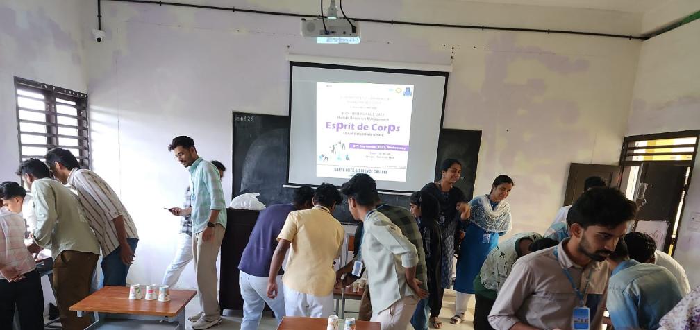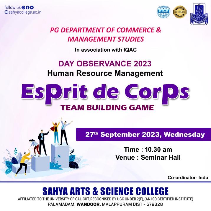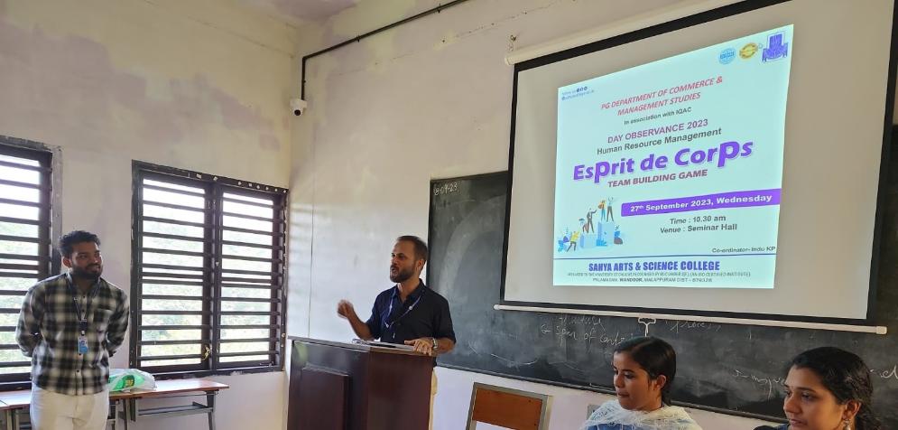 - PG Department of Commerce and Management Studies, Sahya Arts and Science College organized a team building game on 27/9/2023 at seminar hall. This program was conducted as part of HRM observance and it focused on how to build a team spirit. The session kicked off at 10:30 AM with a warm welcome by Ansab C. (Asst. Prof. PGDCMS), setting the tone for a day filled with camaraderie and teamwork. Dr. (Lt.) Abdul Rabbi Nistar, the esteemed Principal of SASC, inaugurated the session, marking the beginning of an exciting adventure. Four teams from our college enthusiastically participated in the event, facing off in two thrilling games. The winners emerged from the spirited competition:
